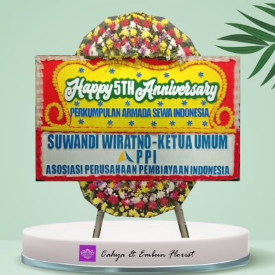 Papan Bunga Anniversary 009, produk pilihan terbaik Cahya & Embun Florist – Toko Bunga Bogor, ukuran 2 x 1,2 (meter) bunga atas bawah, untuk ucapan selamat ulang tahun, happy anniversary, dirgahayu, dan lain-lain.