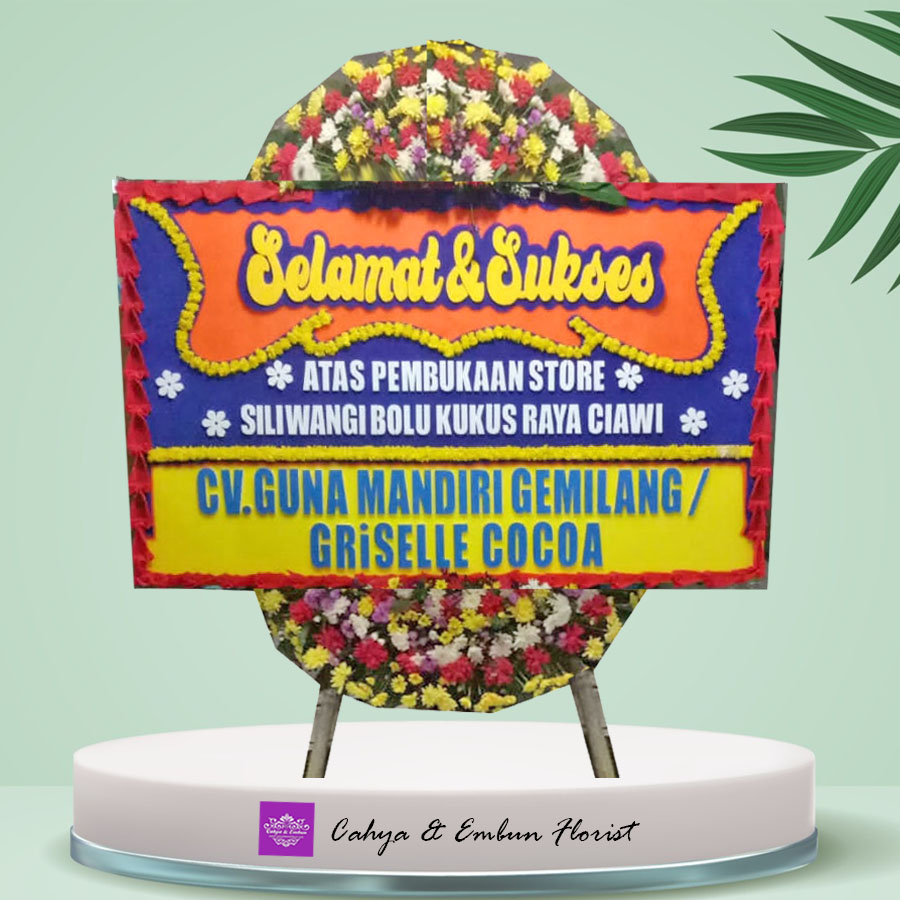 Papan Bunga Selamat & Sukses 018, produk pilihan terbaik Cahya & Embun Florist – Toko Bunga Bogor, ukuran 2 x 1,2 (meter) bunga atas bawah, untuk ucapan selamat & sukses pada acara wisuda, pembukaan, dan lain-lain.