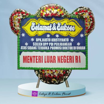 Papan Bunga Selamat & Sukses 027, produk pilihan terbaik Cahya & Embun Florist – Toko Bunga Bogor, ukuran 2 x 1,5 (meter) bunga jambul 3, untuk ucapan selamat & sukses pada acara wisuda, pembukaan, dan lain-lain.